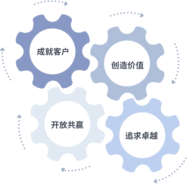 成就客户是一切决策的出发点,,,创造价值是衡量所有工作的标准,,,追求卓越是我们做事做人的态度,,,,开放共赢是我们的格局也是最终的结果。。。。价值观的齿轮环环相扣,,推动着组织里的每个人不断向前。。。。